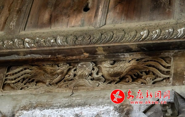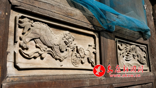 東院建于民國初期,上廳房五間,東西各有廂房兩間,磚木結(jié)構(gòu),青瓦蓋頂,磚雕翹首花脊,青磚墻體。大門呈外八字形,門上有兩座昂然翹起的馬頭墻,高大雄偉、氣勢磅礴,墀頭上有浮雕彩繪圖案。院內(nèi)四周檐墻一米以下為青磚砌筑,鑲嵌有磚雕圖案。一米以上均為雕花木板構(gòu)成,雕刻有福、祿、壽、喜,花鳥、動(dòng)物等圖案。上廳挑、枋雕有鹿、鶴、魚、松和二龍戲珠圖案。整個(gè)建筑的木、石、磚雕十分精美,雕工精細(xì)、形象逼真。