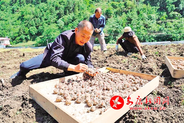 藺河鎮(zhèn)蔣家關(guān)村產(chǎn)業(yè)大戶、立新魔芋農(nóng)民專業(yè)合作社負(fù)責(zé)人的王永成,挑選基地培育適應(yīng)當(dāng)?shù)卦苑N高產(chǎn)魔芋種子下田。