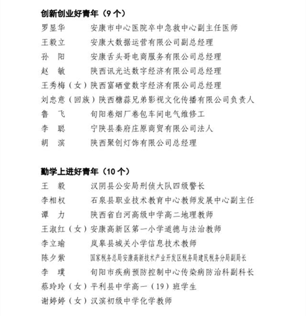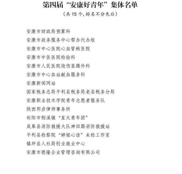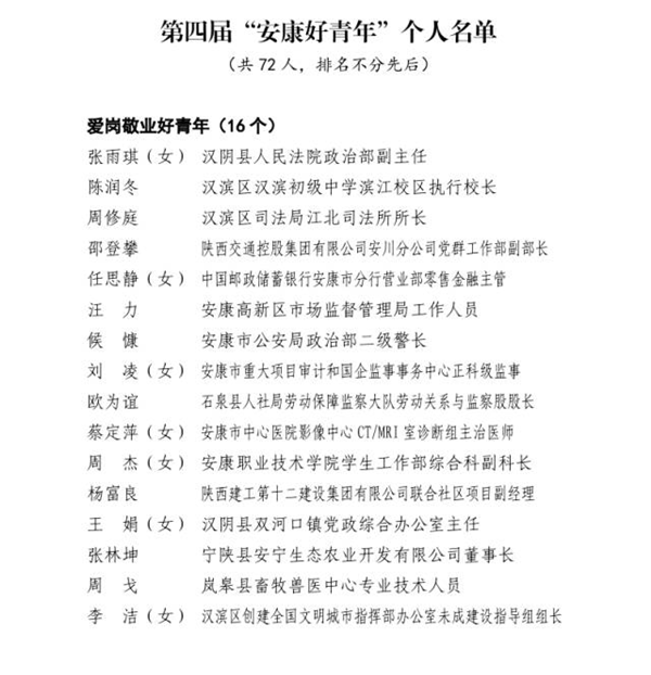 近日,由市委組織部、市委宣傳部、市委文明辦、市委政法委、市委網(wǎng)信辦、市教體局、市科技局、市民政局、市人社局、市鄉(xiāng)村振興局、市衛(wèi)健委、團(tuán)市委、市青聯(lián)共同開展的第四屆“‘中國夢(mèng)·青年志’——尋找身邊的安康好青年”主題活動(dòng)結(jié)果揭曉。