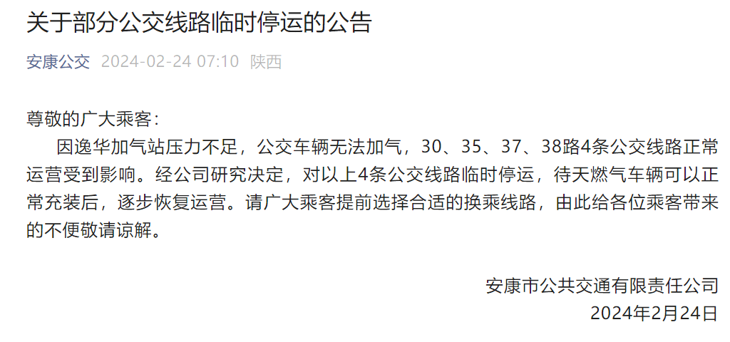 2月24日7時(shí),市公交公司發(fā)布通知:因逸華加氣站壓力不足,公交車輛無法加氣,30、35、37、38路4條公交線路正常運(yùn)營受到影響。經(jīng)公司研究決定,對以上4條公交線路臨時(shí)停運(yùn),待天燃?xì)廛囕v可以正常充裝后,逐步恢復(fù)運(yùn)營。2nF安康新聞網(wǎng)