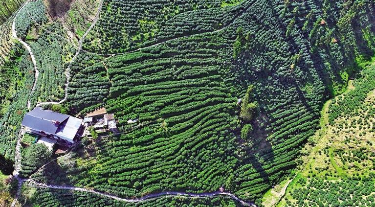 3月27日航拍的安康市紫陽(yáng)縣煥古鎮(zhèn)茶園。 陜西日?qǐng)?bào)記者 田若楠攝
