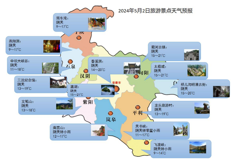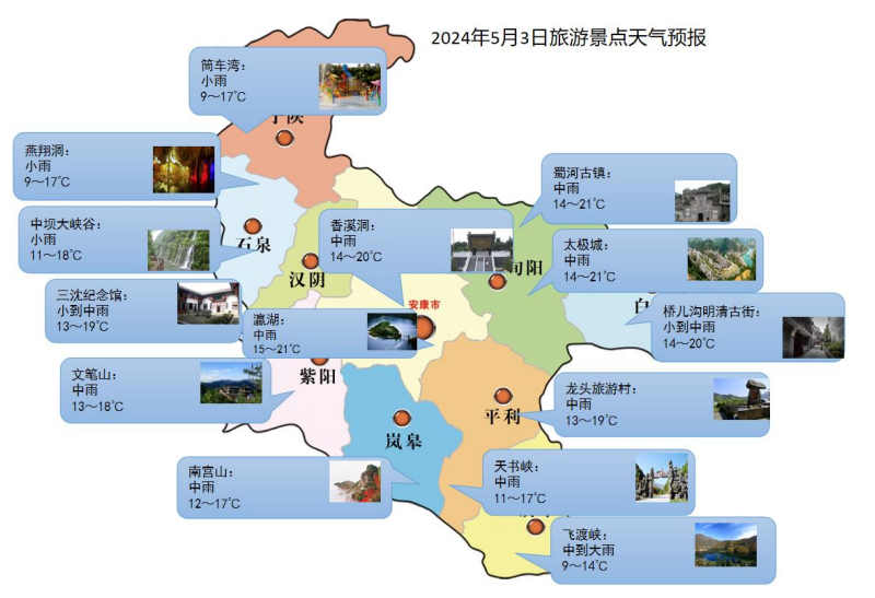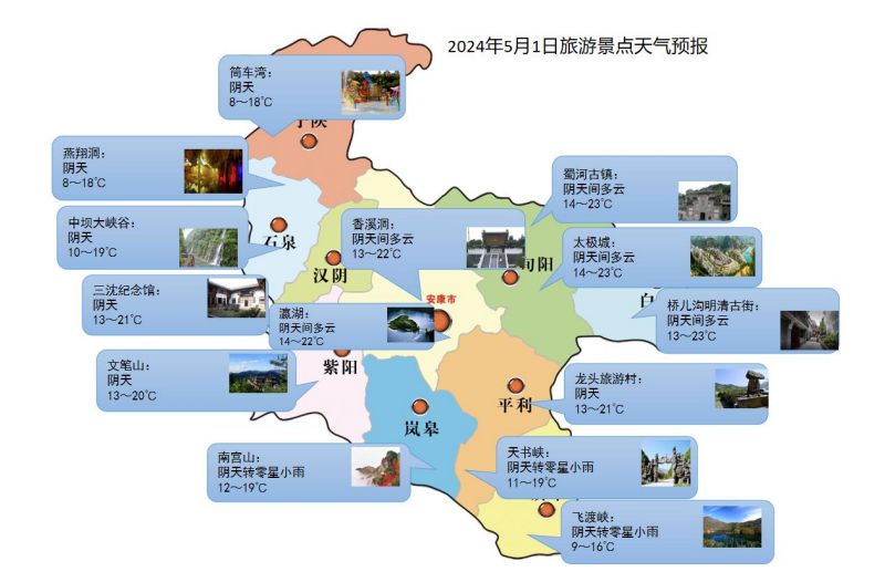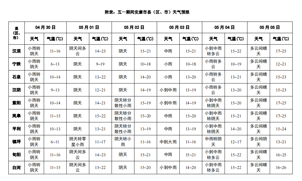 溫馨提示:5月1—2日我市以陰天到多云天氣為主,溫度適宜,空氣質量較好,適合外出游玩;3—4日有明顯降水天氣降水過程,需防范降水導致的道路濕滑、低能見度等對道路交通的不利影響。公眾可及時關注最新預報預警信息,合理安排出行時間。SQr安康新聞網(wǎng)