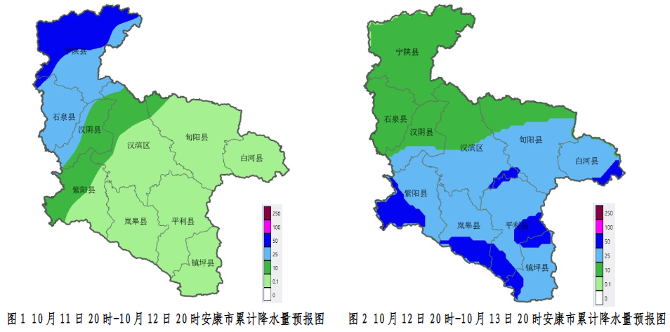 10月12日:全市大部陰天轉(zhuǎn)大雨(25~45毫米),紫陽大部、嵐皋南部、平利中南部、鎮(zhèn)坪、漢濱南部、白河局地有暴雨(超過50毫米),過程期間局地伴有雨強(qiáng)超過10毫米/小時的強(qiáng)降水;XzJ安康新聞網(wǎng)