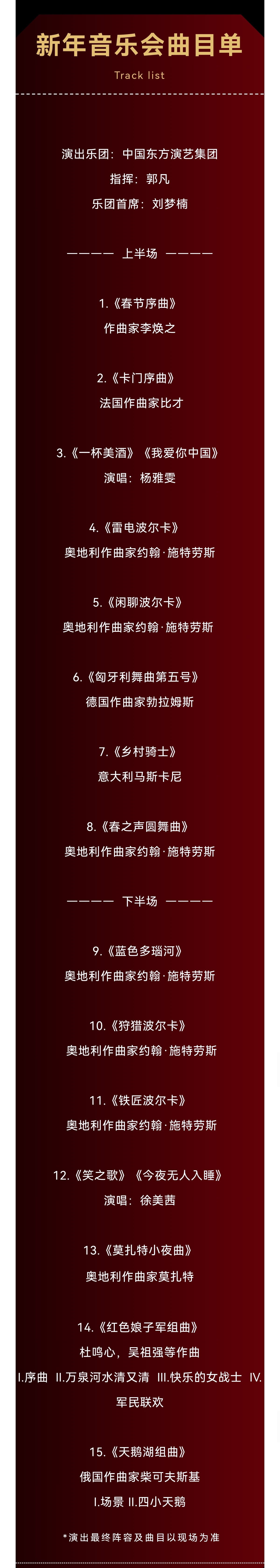 本場音樂會以“喜迎新年”為篇章,精粹二十首左右的中外“新年代表”經(jīng)典樂曲,獨具中國東方韻味的名曲和維也納新年音樂會的傳統(tǒng)樂曲,曲目中西合璧,加入極富創(chuàng)意的樂曲編排,歡快宏大、激情洋溢的音樂風(fēng)格,讓跨年氛圍與交響融合得渾然一體,在歡樂喜悅的音樂旋律中表達對新年新氣象的期盼與向往。