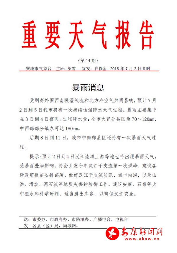 安康新聞網(wǎng)訊(記者 張世虎)7月2日上午,記者從安康市氣象局暴雨天氣通報(bào)會(huì)上獲悉,從2日到5日我市將迎來持續(xù)性強(qiáng)降水天氣,其中暴雨主要集中在3日至4日夜間。全市大部分縣區(qū)過程降水量為70-120mm,中西部部分鎮(zhèn)辦降水量將達(dá)到或超過180mm。市氣象局已啟動(dòng)重大氣象災(zāi)害(暴雨)Ⅲ應(yīng)急響應(yīng)命令。