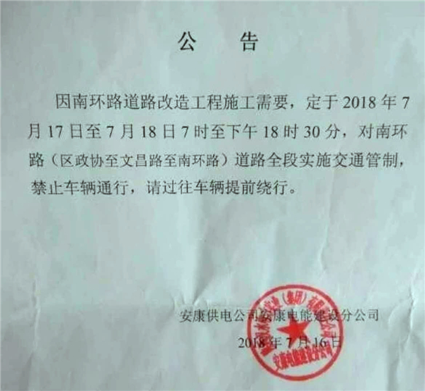 安康新聞網(wǎng)訊(記者 牟慶紅)因南環(huán)路改造工程施工需要,施工方定于7月17日、18日早上7時至下午18時30分,對南環(huán)路(香溪路至文昌路段)道路兩側(cè)架空電力線路,進行導(dǎo)線拆除和拔除電桿工作。NsD安康新聞網(wǎng)