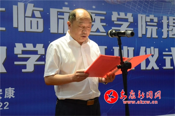 安康市中醫(yī)院院長(zhǎng)陳文乾致辭,楊景峰宣讀陜西中醫(yī)藥大學(xué)關(guān)于成立第七臨床醫(yī)學(xué)院的決定,王瑞輝、王龍軍為陜西中醫(yī)藥大學(xué)第七臨床醫(yī)學(xué)院揭牌,安康市中醫(yī)院黨委書記郭圣杰宣讀醫(yī)院關(guān)于成立6個(gè)教研室的通知,王瑞輝、楊彬講話。儀式由安康市中醫(yī)院副院長(zhǎng)王曉玲主持。