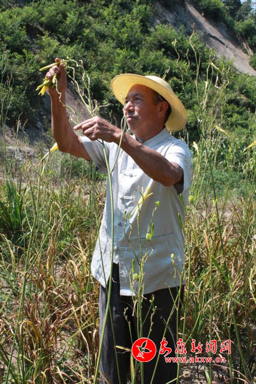 邊介紹著趙德友轉(zhuǎn)身拿來草帽,引著記者前往“讓他高興”的一畝二分地黃花地,邊走邊說:“今年黃花菜還沒有進(jìn)入豐產(chǎn)期,所以自家也種了玉米、花生等作物,有時(shí)候也忙不過來,我和老伴兒呢,早上4點(diǎn)多就起床,不到5點(diǎn)就打著手電到地里除雜草、防蟲。想著明年才能到豐產(chǎn)期,也就沒怎么施肥,但沒想到今年6月開始黃花盛開,想著老兩口就能摘得過來,沒想到了后來不得不找鄰居幫忙摘花。”