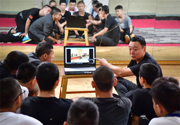 9月12日,“童子班”特聘的武戲老師、河北省京劇院國(guó)家一級(jí)演員楊向國(guó)(后排右)在練功房?jī)?nèi)與學(xué)員們觀看教學(xué)片。