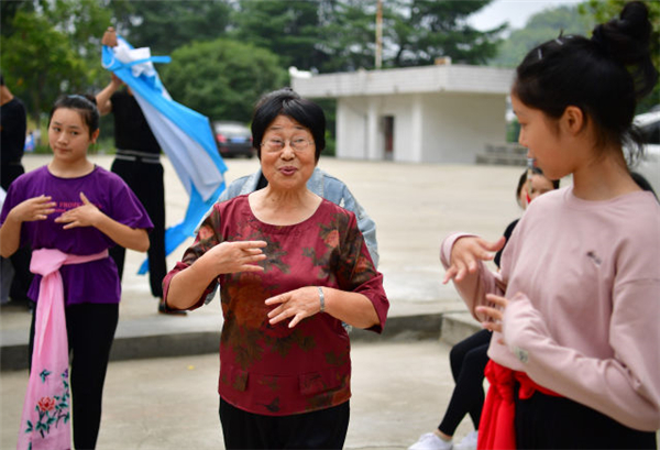 9月12日,漢調(diào)二黃國(guó)家級(jí)傳承人王發(fā)蕓(中)在向“童子班”學(xué)員示范劇目中的動(dòng)作。