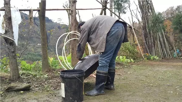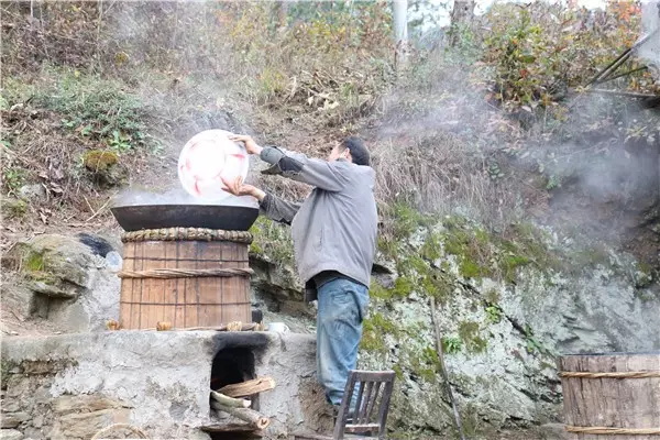 燒火的人要注意觀察火勢的大小,留心酒糟翻騰的泡泡,不時用手測測上面鐵鍋里水的溫度。上面鐵鍋里的水總在不斷升溫。大概到三十度的時候就要舀出來,重新注入涼水。否則就不能起冷凝作用,蒸騰上去的酒會跑掉。