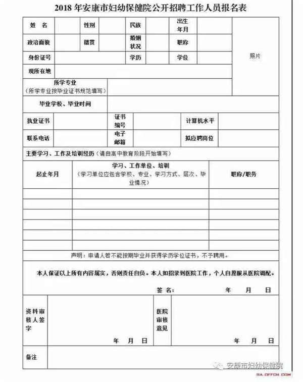 3.報名要求:應聘人員需在報名前,登錄安康市婦幼保健院官網(wǎng)(http://www.akfy.com.cn),下載打印《2018年安康市婦幼保健院公開招聘工作人員報名表》,用黑色中性筆填寫,提供近期2寸免冠照片2張、本人身份證、畢業(yè)證、教育部學歷在線驗證報告、學位證、就業(yè)推薦表(應屆生)及應聘崗位需要的證書原件及復印件。