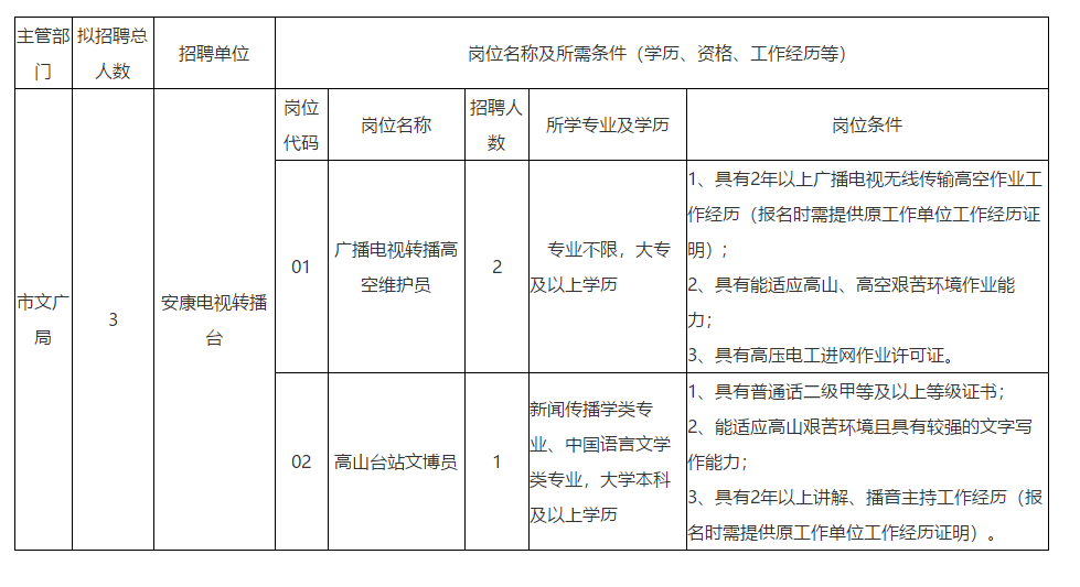 附件:安康電視轉(zhuǎn)播臺(tái)(大東山)2018年特殊崗位人才招聘崗位一覽表