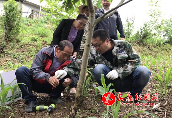 日前,高橋鎮(zhèn)雙龍村的核桃園里來了一群特殊的客人。他們沒有白大褂,而是一身迷彩的科技工作人員。手里拿著電鉆、針劑蹲在核桃樹下給村民示范講解技術(shù)要領(lǐng)。“對(duì)著果樹的根部,用電鉆斜角打孔2公分左右,剪掉針劑的頭,然后把針插進(jìn)去就好了”。“嘿!這個(gè)辦法好,簡(jiǎn)單唆!”,村名劉永宣說到。交談中得知,劉永宣今年70歲了,家里有兩畝核桃,三四年都沒有收成?粗鴴熘,不是黑咯!就是提前掉落。以前給核桃樹打藥奏背個(gè)藥箱噴一哈,可奏是么得啥效果。眼瞅著好好的果樹,就是變不了錢,他也著急。