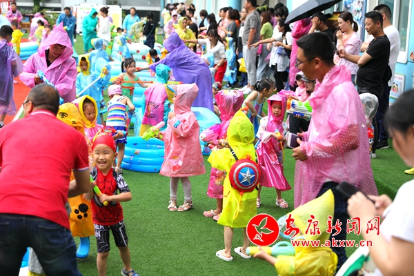 在“歡樂(lè)潑水節(jié)”活動(dòng)中,繽紛泳裝秀、五彩的泡泡、水槍、蓄水池,雨衣等成了一道道靚麗的風(fēng)景線;孩子們舉起水槍,家長(zhǎng)們拿起小盆,你一槍,我一盆,他一桶“還擊戰(zhàn)”“追趕術(shù)”……尖叫聲、歡呼聲、笑聲、吶喊聲,此起彼伏,操場(chǎng)頓時(shí)變成了歡樂(lè)的海洋,宛若一個(gè)靈動(dòng)的童年畫(huà)卷。