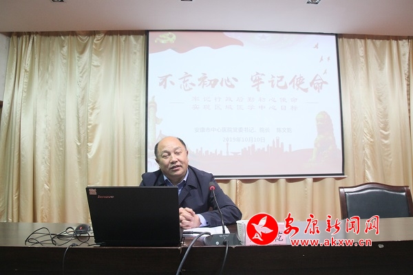 本網(wǎng)訊 10月10日晚上7點(diǎn),安康市中心醫(yī)院召開(kāi)“不忘初心、牢記使命”主題教育專(zhuān)題黨課,醫(yī)院黨委書(shū)記、院長(zhǎng)陳文乾以“牢記行政后勤初心使命,實(shí)現(xiàn)區(qū)域醫(yī)學(xué)中心目標(biāo)”為題,從“牢記醫(yī)院行政后勤初心使命、當(dāng)前行政后勤存在的主要問(wèn)題、做好新時(shí)期醫(yī)院行政后勤工作”等三個(gè)方面進(jìn)行專(zhuān)題黨課輔導(dǎo)。院領(lǐng)導(dǎo)班子成員、行政職能后勤人員200余人聆聽(tīng)了黨課。副院長(zhǎng)董根文主持專(zhuān)題黨課。