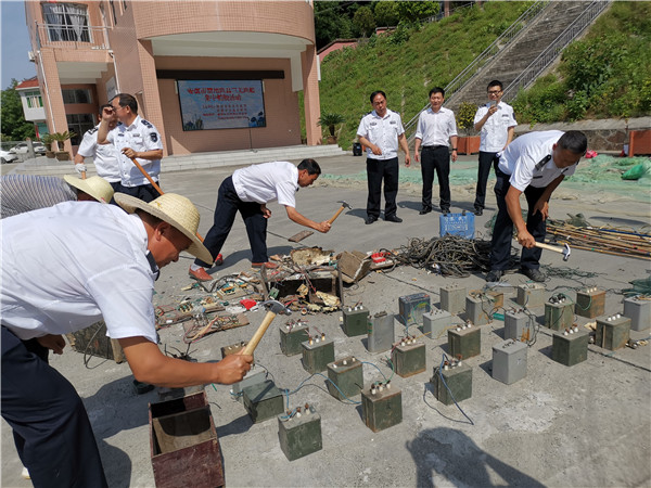 5月22日上午,陜西省農(nóng)業(yè)農(nóng)村廳漁業(yè)漁政局、安康市農(nóng)業(yè)農(nóng)村局在瀛湖海事碼頭聯(lián)合開展禁用漁具及“三無”漁船銷毀活動,集中銷毀了570余副“絕戶網(wǎng)”共1萬余米,銷毀電魚設(shè)備21套。