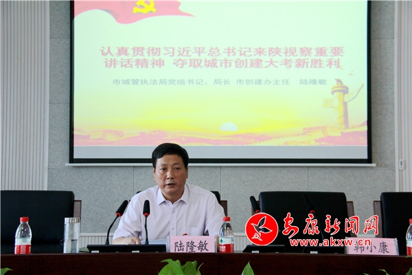 市城管執(zhí)法局黨組書記、局長(zhǎng)、市創(chuàng)建辦主任陸隆敏以“認(rèn)真貫徹習(xí)近平總書記來(lái)陜視察重要講話精神,奪取城市創(chuàng)建大考新勝利”為題,從深入學(xué)習(xí)貫徹習(xí)近平總書記來(lái)陜來(lái)安重要講話精神、緊盯目標(biāo)任務(wù)決勝大戰(zhàn)大考、強(qiáng)化作風(fēng)建設(shè)勇于擔(dān)當(dāng)作為三個(gè)方面,結(jié)合城市創(chuàng)建、城市管理工作實(shí)際和自身學(xué)習(xí)思考,給全體黨員上了一堂內(nèi)涵豐富、思想深刻的專題黨課。