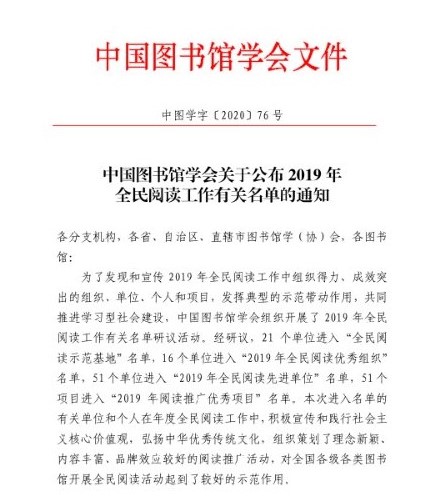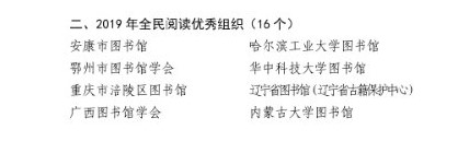全國16個單位被評為“2019年全民閱讀優(yōu)秀組織”,其中高校圖書館4個,公共圖書館12個。安康市圖書館在2019年全民閱讀宣傳工作中,積極宣傳和踐行社會主義核心價值觀,弘揚(yáng)中華優(yōu)秀傳統(tǒng)文化,組織策劃開展了“全市同讀一本書”、“全市同讀一小時”、“全市同讀一類書”等“全市同讀”系列活動,形成了全市一盤棋的業(yè)務(wù)格局,充分發(fā)揮了市館的“中心引領(lǐng)”作用,深入推進(jìn)了全民閱讀工作。