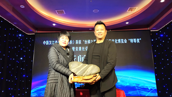 新聞發(fā)布會上,中國觀賞石鑒評師、漢江流域漢江石專家組成員王鐵石同志介紹漢江奇石《絲路韻》獲獎情況。安康市政協(xié)原副主席李啟良、黃秀玲上臺為安康社促會奇石協(xié)會成立揭牌。安康市社促會奇石協(xié)會向石泉縣金蠶小鎮(zhèn)鎏金銅蠶博物館贈送了漢江奇石《蠶寶寶》。