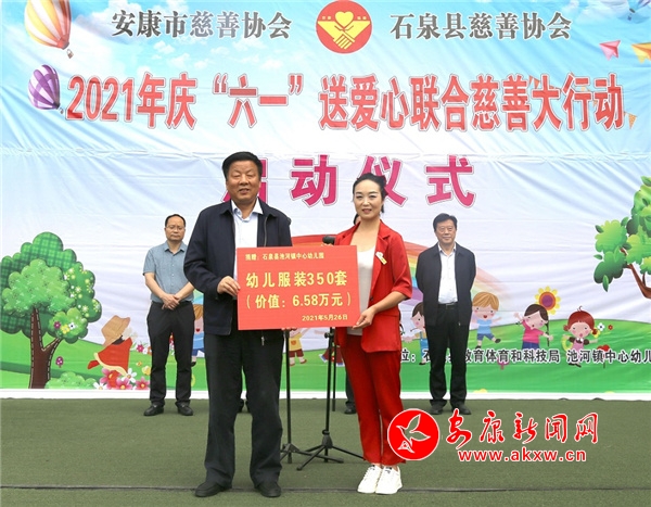 本網(wǎng)訊(通訊員 張蕾)5月26日,安康市慈善協(xié)會(huì)2021年慶“六一”向困難兒童送愛心慈善聯(lián)合大行動(dòng)在石泉縣池河鎮(zhèn)中心幼兒園正式啟動(dòng)。此次活動(dòng)主題為“童心筑夢(mèng)•愛暖明天”,旨在用大愛溫暖孩子們的心,讓他們感受到社會(huì)各界的關(guān)愛,在愛的呵護(hù)下健康快樂成長。