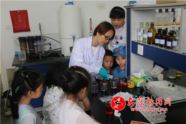 在實驗室里,工作人員向孩子們展示了食品化學實驗的奧妙,并指導下孩子們親自動手完成了各種小實驗,有“五彩繽紛的飲料”、“有趣的顏色變化”、“魔術(shù)瓶”等等。當孩子看到那些化學試劑像魔術(shù)一樣變化出各種色彩、產(chǎn)生出濃濃氣體時,都充滿了好奇和疑惑的神情,嘰嘰喳喳地問個不停,實驗員一一細致耐心的解答。