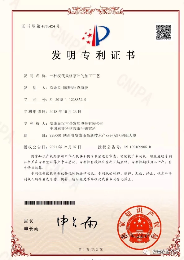 近日,由安康秦漢古茶發(fā)展股份有限公司和中國(guó)農(nóng)業(yè)科學(xué)院茶葉研究所聯(lián)合申報(bào)的發(fā)明專(zhuān)利“一種漢代風(fēng)格茶葉的加工工藝”獲得國(guó)家知識(shí)產(chǎn)權(quán)局授權(quán)(專(zhuān)利號(hào):ZL201811238852.9),自此安康最早的茶有了法律保障(專(zhuān)利法)。