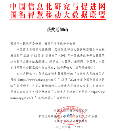 本次評估以“數字政府建設驅動中國數字化轉型”為主題,依據“分類指導、創(chuàng)新引領”工作思路,針對全國各級黨政部門數字政府平臺建設、黨務政務網站、黨務政務新媒體開展分級分類測評。評估以建設公開、透明、智慧、實用、便捷、高效的數字政府政務平臺為目標,推薦評選出2021年中國最具影響力、最給力、最具動員力、最具傳播力黨務政務平臺、最具創(chuàng)新力數字政府管理平臺、數字政府創(chuàng)新型政務平臺、中國領先和優(yōu)秀政務網站、外文版政府網站國際化程度、最具影響力和優(yōu)秀政務新媒體等成果。安康市人民政府網站、安康高新技術產業(yè)開發(fā)區(qū)網站均獲評“2021年度中國優(yōu)秀政務網站”。