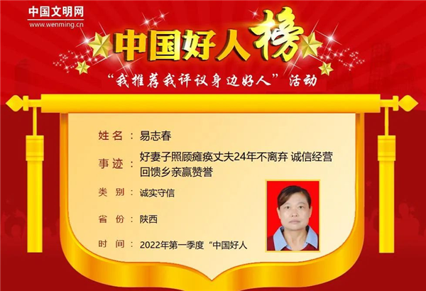 褒揚誠信 | 安康易志春榮登2022年第一季度“中國好人榜”
