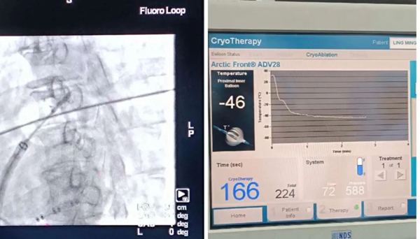 經過詳細術前準備工作后,通過穿刺股靜脈,將導管沿靜脈進入右心房,經房間隔穿刺后,將球囊分別放置在四個左心房-肺靜脈連接處,充盈球囊,使球囊完全封堵靶肺靜脈的血液回流,利用球囊尾端連接的制冷系統,將球囊溫度迅速降低至40℃以下,使局部組織壞死,達到電隔離肺靜脈的目的。術中驗證四個肺靜脈電位均消失,房顫不能被誘發(fā),手術成功。