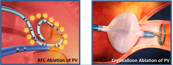 導管消融手術是房顫的根治性治療手段,目前在房顫介入治療領域,存在著一曲冰與火之歌——冷凍球囊消融技術與射頻消融技術。前者是通過電灼燒使靶點細胞變性壞死,后者則是通過冷凍劑蒸發(fā)吸取組織的大量熱量,快速降溫來實現消融。