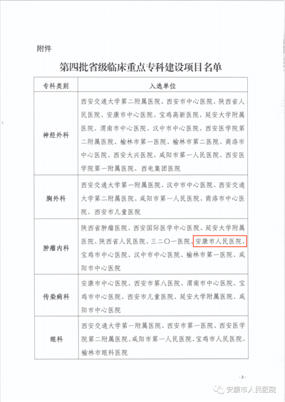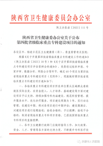 近日,陜西省衛(wèi)生健康委發(fā)文公布了第四批省級(jí)臨床重點(diǎn)?平ㄔO(shè)項(xiàng)目名單,安康市人民醫(yī)院腫瘤內(nèi)科名列其中,順利被評(píng)定為省級(jí)臨床重點(diǎn)專科建設(shè)項(xiàng)目。