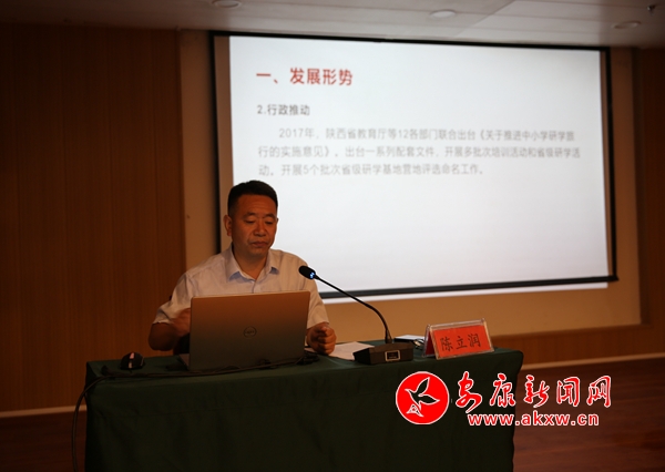 安康市教育學(xué)會(huì)會(huì)長(zhǎng)、安康市大中小學(xué)研學(xué)旅行實(shí)踐教育基地共同體理事長(zhǎng)陳立潤(rùn)作《安康市大中小學(xué)研學(xué)實(shí)踐教育活動(dòng)的探索與思考》專題報(bào)告,報(bào)告圍繞發(fā)展形勢(shì)、亟待解決的問題、課程體系建設(shè)、共同體的工作方向四個(gè)方面深入淺出地剖析了安康研學(xué)旅行教育活動(dòng)發(fā)展的現(xiàn)狀及未來發(fā)展方向。