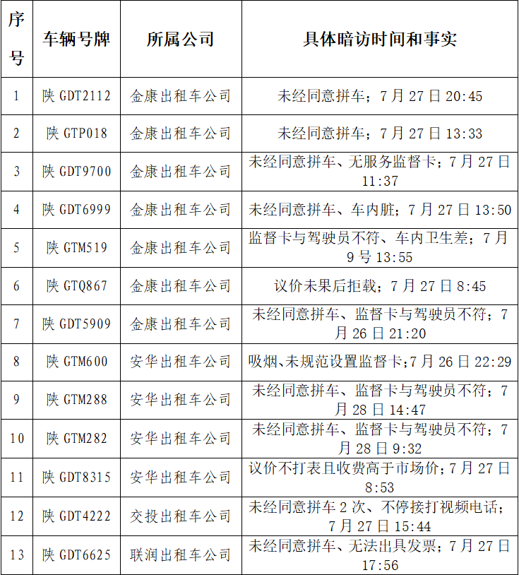 市交通運(yùn)輸局將暗訪(fǎng)結(jié)果與日常營(yíng)運(yùn)情況相結(jié)合,對(duì)營(yíng)運(yùn)規(guī)范的20名出租車(chē)駕駛員予以通報(bào)表彰,對(duì)13名“差”格次車(chē)輛駕駛員進(jìn)行通報(bào)批評(píng)。