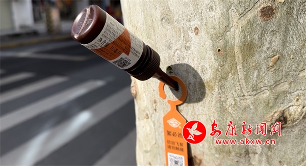 在城區(qū)育才路,市政園林工作人員先在法桐的樹干上斜鉆出一個數(shù)厘米深的小洞,然后把一支褐色瓶子插在樹洞中。安康市市政園林處綠化管護科副科長龔晨曦介紹,給法桐注射的藥物名叫“絮必治”,通過插瓶輸液法,在樹干打孔,把藥劑輸入樹體內(nèi),藥劑會隨著蒸騰作用擴散到樹體各部分,抑制花芽形成,從而不開花結(jié)果,達到控制懸鈴木飛絮的目的。今年計劃對城區(qū)500株法桐進行試點打藥,其原理就是通過藥物不讓果實成熟,也就不會有飛絮。同時也會采用修剪枝葉、夏季夜間高壓水槍噴水等方式,最大限度緩解法桐飛絮漫天飛舞擾民的現(xiàn)象,逐年逐步減少對市民的影響。