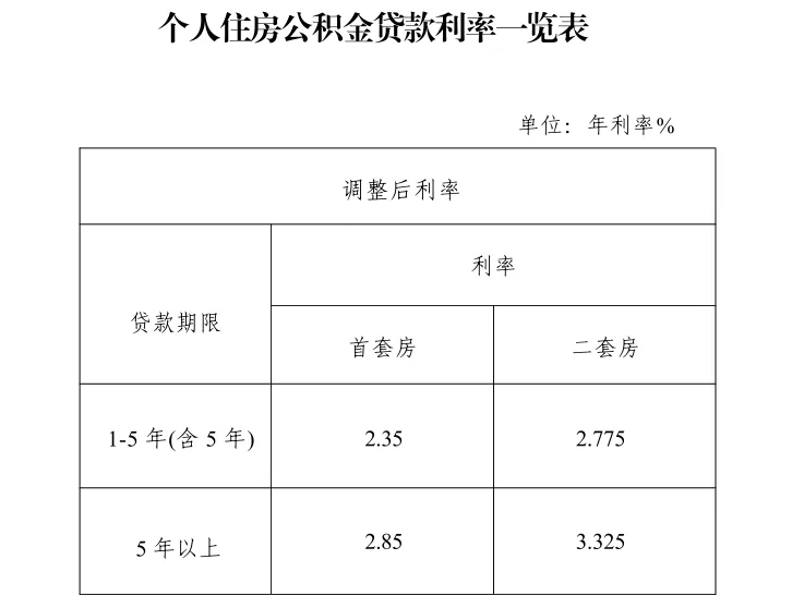 首套個(gè)人住房公積金貸款5年以下(含5年)和5年以上利率分別調(diào)整為2.35%和2.85%。