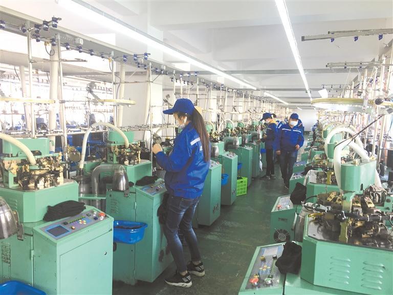 裝上棉紗、調(diào)好數(shù)據(jù)、按下開關(guān),只見織襪機齒輪開始飛速運轉(zhuǎn)、針筒反復(fù)運動……不到3分鐘便有了襪子的雛形。次日一早,負責(zé)縫頭的農(nóng)戶便會上門取走襪胚,進行下一……