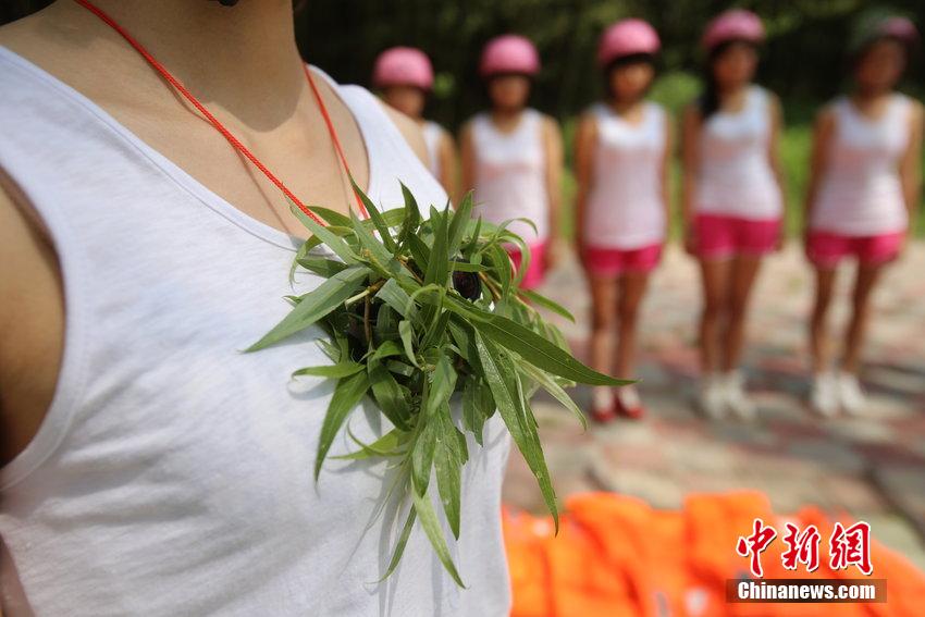 4月29日,河南省三門峽市女子漂流救援隊員佩戴偽裝成花草的視頻記錄儀,對漂流河道進行安全檢查。該視頻記錄儀可放置在頭頂對全身進行監(jiān)控、也可以放置在胸部、下身等處對局部進行監(jiān)控。據(jù)了解,這種裝備是為了防止少數(shù)故意落水的男游客,對女救援隊員動手動腳的不文明行為。圖片來源:CFP視覺中國3Up安康新聞網(wǎng)