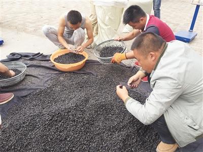 篩子里豌豆粒大小的黑枸杞,夾雜在土塊石子之間翻滾。他把黑枸杞濾出來(lái),放在一邊,枸杞葉子放在另一邊,剩下的雜物,讓工人用手挑選,“一粒也別剩下。”