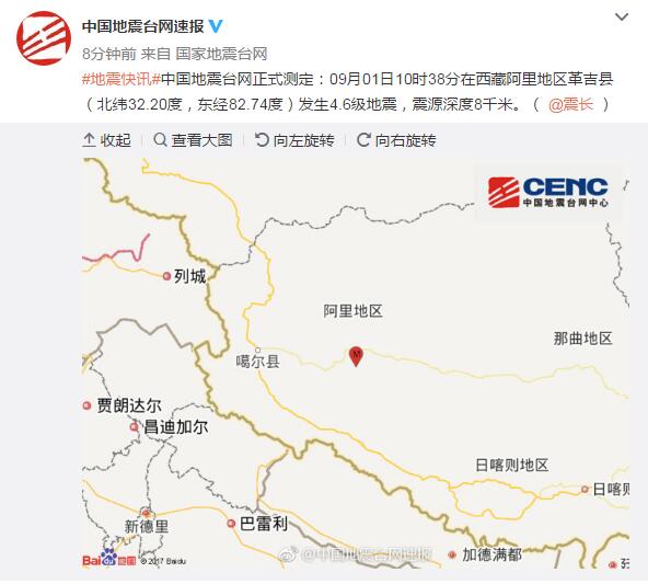 人民網(wǎng)北京9月1日電 據(jù)中國(guó)地震臺(tái)網(wǎng)正式測(cè)定,9月1日10時(shí)38分在西藏阿里地區(qū)革吉縣(北緯32.20度,東經(jīng)82.74度)發(fā)生4.6級(jí)地震,震源深度8千米。z75安康新聞網(wǎng)