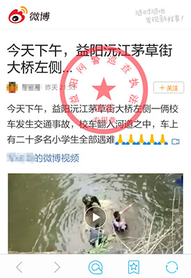 【傳聞】9月7日,一名為“軍砣哥”的網(wǎng)民在微博發(fā)帖稱,“今天下午,益陽茅草街左側(cè)一輛校車發(fā)生交通事故,校車翻入河道之中,車上有二十多名小學(xué)生全部遇難”,并附上現(xiàn)場車輛墜河視頻,該消息很快被部分網(wǎng)民轉(zhuǎn)發(fā)。