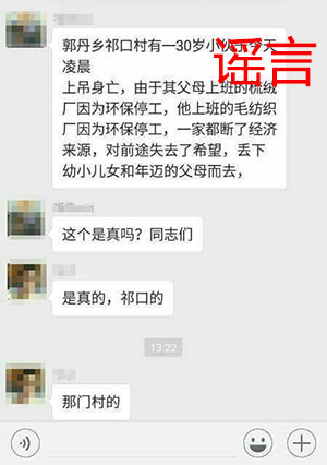 【傳聞】網(wǎng)傳“河北保定蠡縣郭丹鄉(xiāng)祁口村有一30歲小伙子今天凌晨上吊身亡。其父母上班的梳絨廠因為環(huán)保停工,他上班的毛紡織廠也因為環(huán)保停工,因為家里都斷了經(jīng)濟來源,遂對前途失去了希望,丟下年幼的兒女和年邁的父母而去”。