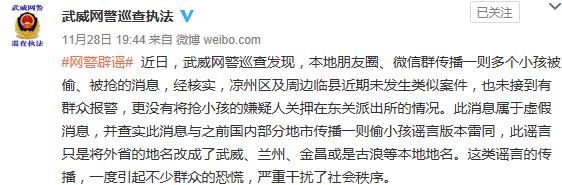 人民網(wǎng)北京11月29日電 (記者孝金波)近日,網(wǎng)絡(luò)有消息稱“甘肅金昌武威被偷了三個(gè)孩子……嫌疑人被關(guān)在武威東關(guān)派出所”等內(nèi)容,引發(fā)網(wǎng)民關(guān)注。28日,武威網(wǎng)警辟謠稱,此消息屬于虛假消息。