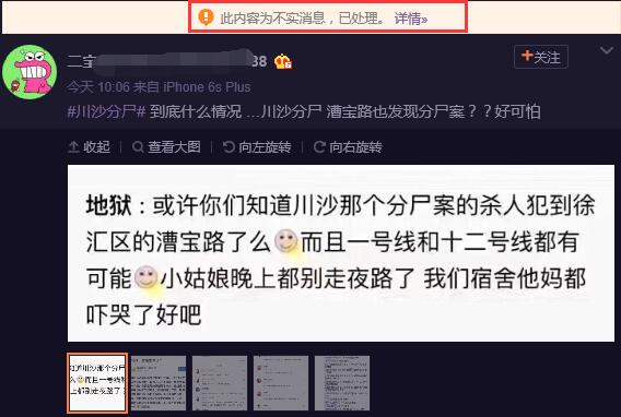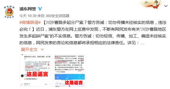 近日,浦東警方在開展網(wǎng)上巡查中發(fā)現(xiàn),不斷有網(wǎng)民在百度帖吧、新浪微博等社交平臺內(nèi)發(fā)布有關(guān)“川沙曹路地區(qū)發(fā)生多起碎尸案”的不實信息。