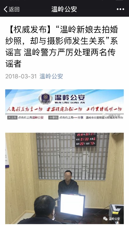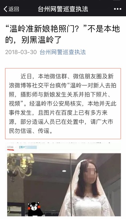 3月30日,臺州市公安局網(wǎng)警官微發(fā)布消息,所謂“溫嶺準新娘艷照門”不是本地的,別黑溫嶺了。其中指出,“本地并無此事件發(fā)生”,該謠言中的“圖片在百度上已有多方來源”,并稱“部分造謠人員已在處置中”。