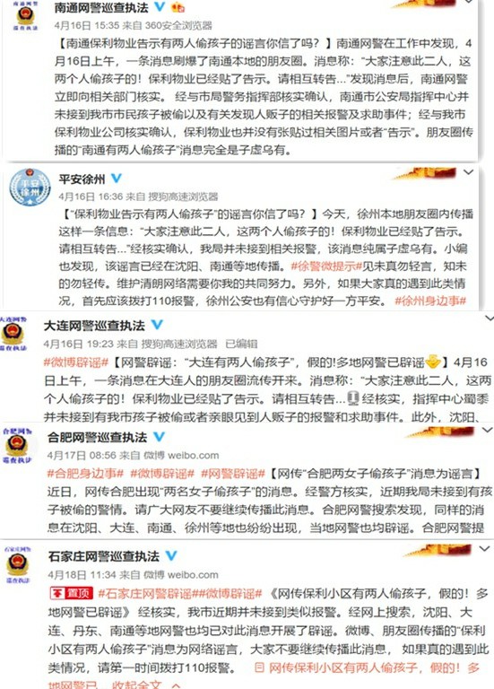 該則消息在沈陽的網(wǎng)民朋友圈中打著“溫馨提示”的名號(hào),聲稱“下圖是偷小孩團(tuán)伙照片,家要有寶寶的注意了”。丹東流傳的版本則為“大家注意此二人,這兩個(gè)人偷孩子的!保利物業(yè)已經(jīng)貼了告示。請(qǐng)相互轉(zhuǎn)告...”