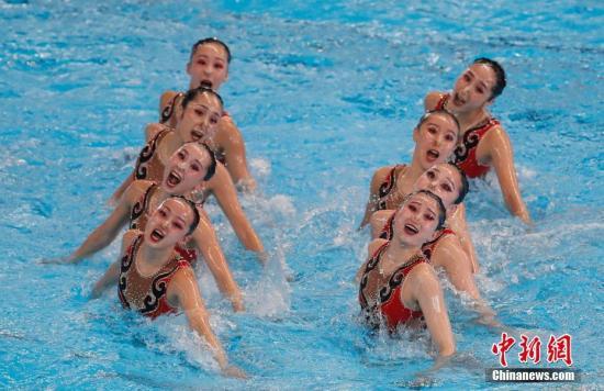 圖片說明:在8月29日下午結(jié)束的雅加達(dá)亞運(yùn)會花樣游泳集體自由自選比賽中,中國隊(duì)?wèi){借《鳳舞國粹》的出色發(fā)揮,奪得金牌。中新社記者 杜洋攝
