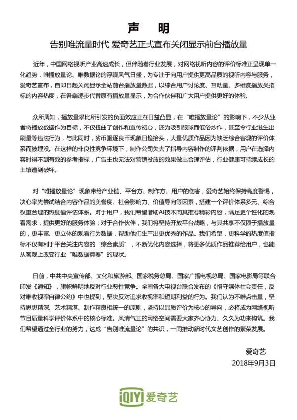 愛奇藝首席內(nèi)容官王曉暉對媒體稱,過度關(guān)注播放量給行業(yè)帶來了諸多不良影響,大量的優(yōu)質(zhì)作品因?yàn)槿狈陀^、公正的評估體系被埋沒。不少從業(yè)者更將播放量簡單攀比,扭曲了創(chuàng)作初心,甚至滋生出刷量等違法或者違反職業(yè)道德的行為。對于“唯播放量論”的不良現(xiàn)象,以及由此帶給產(chǎn)業(yè)鏈、平臺(tái)、制作方、用戶的傷害,我們保持高度的警惕。為了改變這種不良風(fēng)氣,愛奇藝決定率先關(guān)閉前臺(tái)播放量顯示,將重心回歸創(chuàng)作并為用戶提供優(yōu)質(zhì)的內(nèi)容和服務(wù)體驗(yàn)。