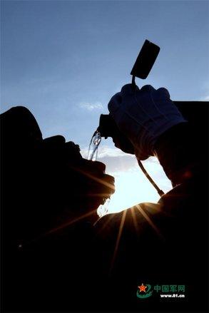 14:00,一名戰(zhàn)士正在飲水。當(dāng)天中午,部分乘員早早就開(kāi)始加班強(qiáng)化訓(xùn)練。