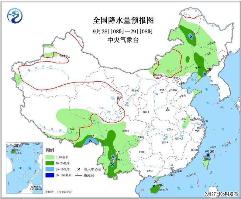 9月27日08時(shí)至28日08時(shí),內(nèi)蒙古中東部、東北地區(qū)西南部、華北西部和北部、西北地區(qū)東部、江漢西部、西南地區(qū)大部、華南中西部、江南西南部和東北部、西藏中東部和臺(tái)灣島等地有小到中雨,其中,四川西南部、云南東北部、廣西中南部、廣東西南部和臺(tái)灣島北部等地的部分地區(qū)有大雨,局地有暴雨或大暴雨(100~120毫米)。新疆東部、內(nèi)蒙古中西部、西北地區(qū)東部等地的部分地區(qū)有4~6級(jí)偏北風(fēng)(見圖1)。
